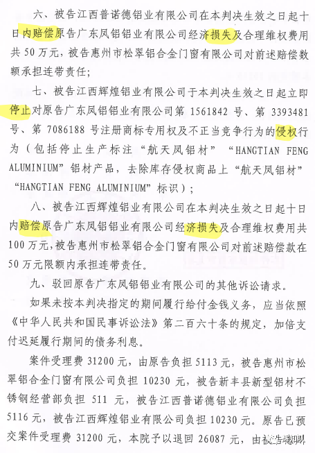 湖州凤铝系列维权案:诉辉煌公司等四被告,法院判赔250余万