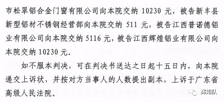 湖州凤铝系列维权案:诉辉煌公司等四被告,法院判赔250余万